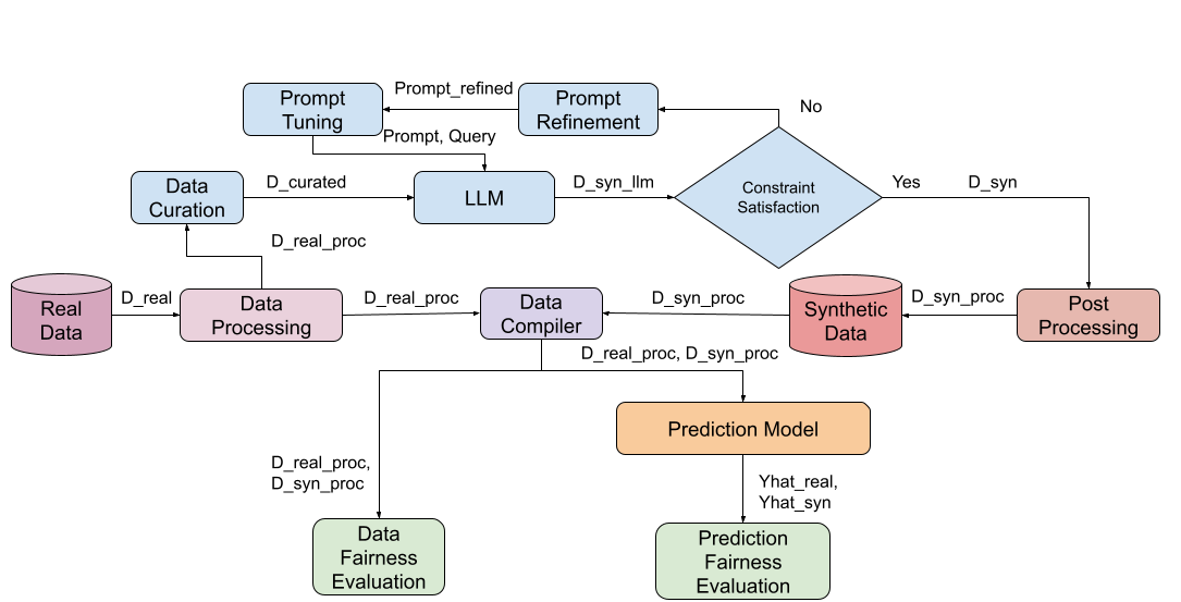 FairTabGen is a large language model–based framework for generating synthetic tabular data that integrates both counterfactual and causal fairness into the generation process. By combining fairness-aware prompting, in-context learning, and iterative refinement, it creates data that is realistic, equitable, and useful for downstream tasks. The framework improves fairness metrics by up to 10% while preserving strong predictive performance, even when working with only a fraction of the original data—making it highly practical for privacy-sensitive and data-scarce applications.