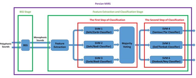This paper introduces the first Persian musical instrument recognition system designed to identify instruments in polyphonic audio recordings. The system operates in two stages: blind source separation using FastICA, followed by feature extraction and a two-step classification process based on Mel-frequency cepstral coefficients and spectral features. It first recognizes the instrument family, then the specific instrument. The model achieves high accuracy, demonstrating its effectiveness for analyzing complex Persian music signals.